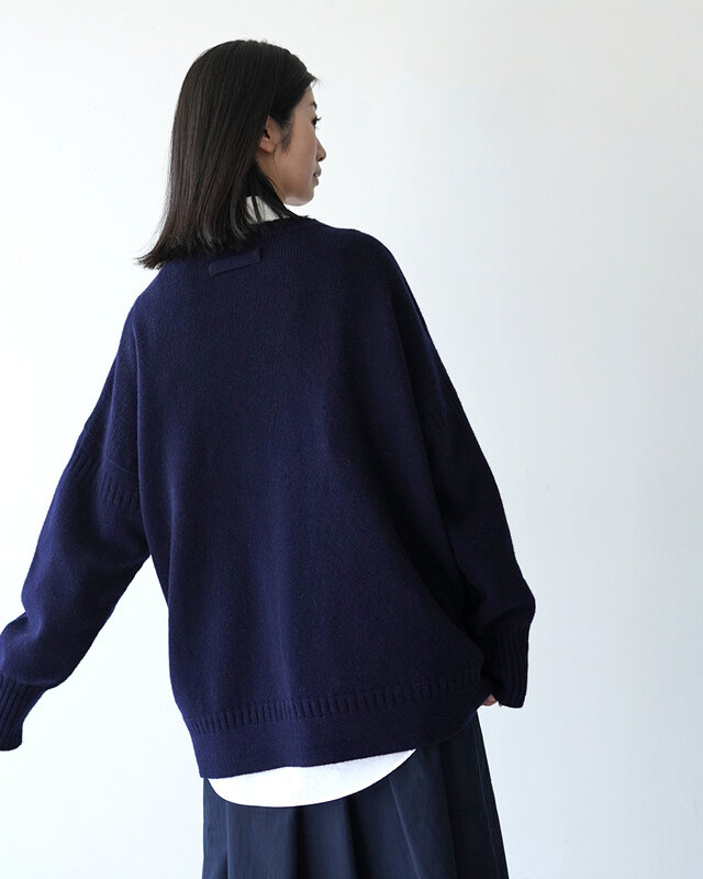 特徴的なアームホールやヘムラインの編み模様などのディテールや雰囲気を残しつつ、シャツなどともレイヤードしやすいビッグシルエット。