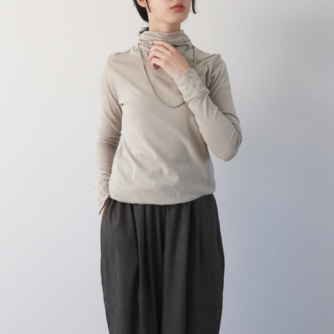 リサイクルコットンを使ったムラ糸リサイクル天竺 裾ひねりタートルネックです。シンプルなタートルでありながら裾や襟をひねりながら縫う事でナチュラルな風合いに仕上げました。