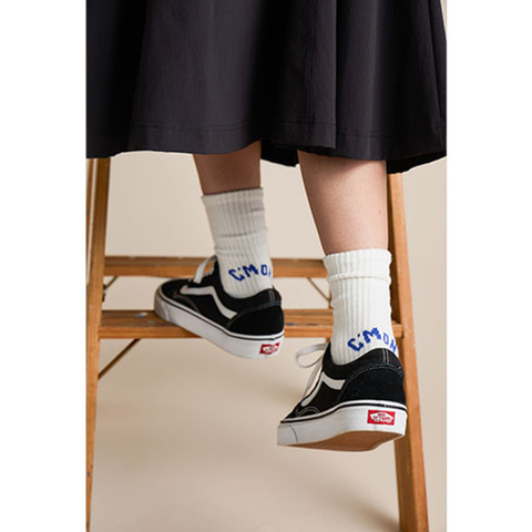 "階段を登るとき、前の人の足元が自分の目線にくることが多いので、かかとからポジティブなメッセージが見えたら気分が良いかな、と思って、このワードを選びました。左右の足取りで、先へ先へ進むイメージです。 パンツとスニーカーの間からちらっと見えるのもかわいい。この低い位置にロゴを入れるのはそんなに簡単なことではないのです。見た目だけじゃなくて、リブ部分のギュっとつまったでも締めつけないフィット感とか、足底のふわふわモチモチの履き心地とか、とても良いのでオススメです。"