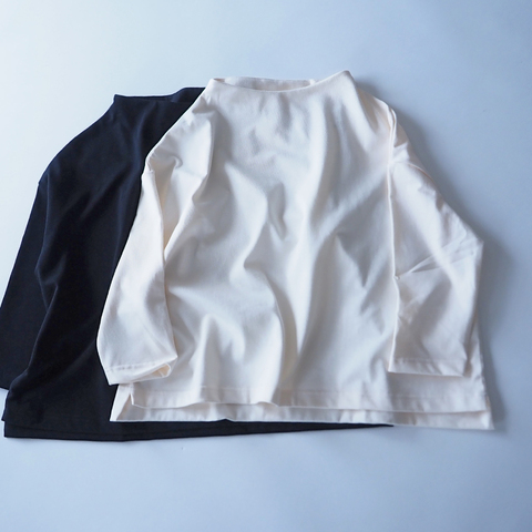 100%コットンで袖を通すだけですっと背筋が伸びる大人のプルオーバーです。ボートネック風オフタートルネックがアクセントとなり、首元をすっきりと見せてくれます。
