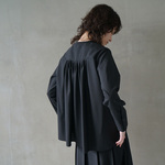 ミニマムなデザインで、比翼のボタンが特徴です。後ヨークには細かなタックを入れてドレープを出しています。前身頃のシンプルさとの対比が魅力です。長めのカフスもポイント。