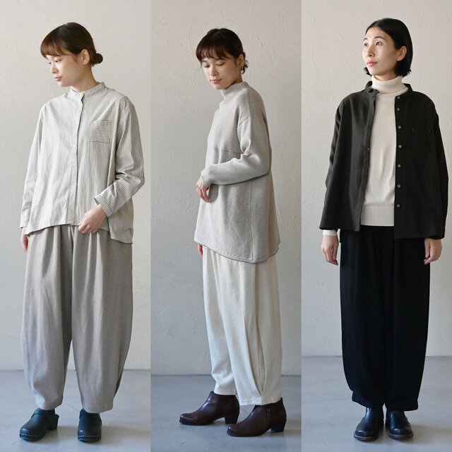 たっぷりのギャザーと足元のタックがあることでギャザーパンツならではのコクーン型がうまれています。