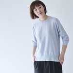 毛羽を抑え清涼感のある風合いに仕上がったコットン100%糸を、肌離れの良い鹿の子編みでシンプルな7分袖ニットに編み上げました。ご自宅で洗えるので汗が気になる時期も気兼ねなく着ることができます。糸には「ロンフレッシュ(R)」という植物由来の天然有機系デオドラント加工を施しているので、においも気になりません。