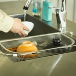 水切りカゴを置くと調理台が狭くなる、使わないときは邪魔になるなど、水切りかごは場所を取るんですよね。 Three Snowの「D型スライドバスケット No.2」は調理スペースも洗い物スペースも邪魔しない水切りかごです。その理由はシンクに渡せることと、浅型であること。浅型だから水切りかごの下にお鍋や洗い桶を入れられるんですね。ワイヤーではなく、メッシュタイプなので汚れが目立ちにくく、水切りかご自体のお手入れも楽々です。
