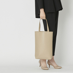 「サブバッグ」は、一般的には、帆布やナイロンなどカジュアルな素材が主流ですよね。でもサブバッグが必要になるのは、冠婚葬祭や学校行事など、きちんとした装いの場面であることも多いもの。その見た目と機能のバランスがいいものって、意外とない。 そんな話がきっかけで誕生したのが、こちらの当店オリジナルのトートバッグです。サイズと素材にこだわり、大人の女性が持つにふさわしいアイテムになりました。 肩掛けできて、スリムに見えるけど大容量。国産の合成皮革を使っているので質感がよく、見た目は革バッグのよう。A4ファイルにノートパソコン、ジャケットなど厚手の羽織りも入るんですよ。